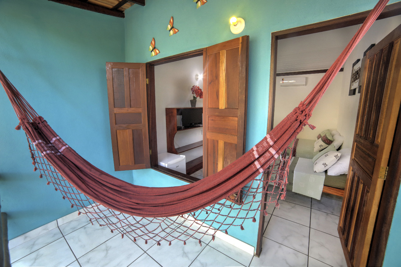 Ao fazer sua reserva em Caraíva, você garante uma suíte espaçosa com decoração que reflete a leveza da vila. A Suite Azul Céu possui uma varanda privativa, o local ideal para momentos serenos. Você pode apreciar a brisa suave e absorver a energia revigorante de Caraíva, longe do burburinho, mas perto da praia e do Rio Caraíva.